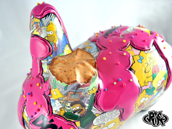 Using a wide range of toys as platforms for his creations, VISEone has based each of the designs on famous comic strips and cartoons. The top layer of the customs portray central characters from the comics, whilst their ‘stripped’ skin reveals detailed collages of the strips themselves, resulting in a very impressive homage to graphic illustration.