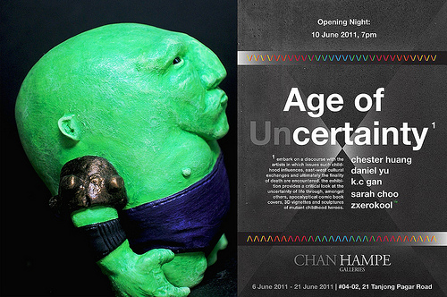 Officially opening tomorrow night (June 10th), Age of Uncertainty is the latest group exhibition from artists Chester Huang, Daniel Yu, K.C Gan, Sarah Choo and Zxerokool. Exploring issues such as childhood influence, the finality of death and the cultural exchange of East-West design, Age of Uncertainty features a wide variety of mixed media including “apocalyptic comic book covers, 3D vignettes and sculptures of mutant childhood heroes”.