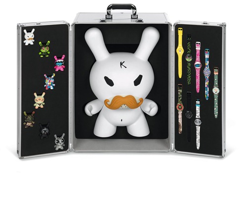Featuring a 20″ Kozik Dunny, 8 3″ Dunnys and 8 matching Swatch watches, the limited edition collectors piece is housed in a foam lined metal case, with the price for the set estimated at around $1000. Artists featured include MAD, Joe Ledbetter, Tara McPherson and the legendary Gary Baseman.