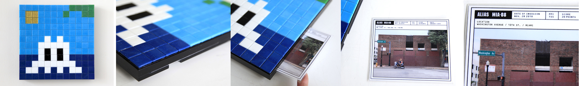 *Every Space Invader put up in the street can be reproduced as an Alias. There is only one Alias per Space Invader. An Alias is made of the replica of the original Space Invader fixed on a black perspex panel which contains its ID card.