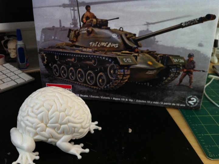 Jason Freeny, an artist featured numerous times here at the Tru:Teknology Files, has recently revealed photos of his entry for the custom Jumping Brain show. Taking a military slant, Freeny has sculpted wheels, tracks and mounted guns, using Garcia’s Jumping Brain as the cockpit for his clever THINK TANK design.