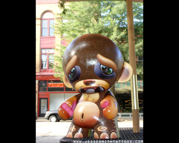 Alongside his beautiful tattoos, Jesse has also built a strong reputation in the emerging urban art scene, with artworks and custom toy designs featuring at the esteemed Munnyworld (pictured) and Drawing Blood exhibitions amongst others. His art has also adorned t-shirt designs for the likes of Bleeding Star, Methods NYC and Politrics.