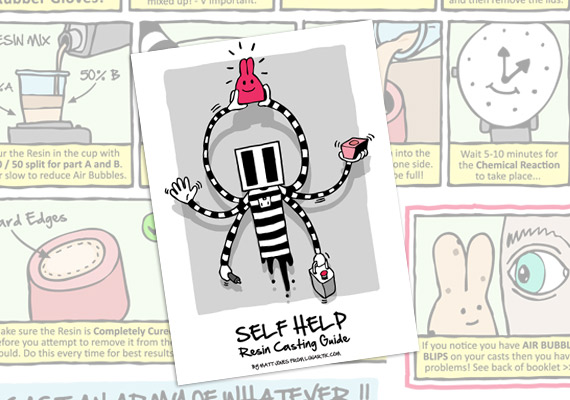 Last, but by no means least, is the arrival of Lunartik’s highly anticipated guide to resin casting. The most economically viable medium for budding toy designers / creators, resin plastic has risen in popularity amongst art toy aficionados in recent years, bringing artists such as Lunartik out of the garage studios and into the limelight. A three page downloadable booklet, Lunartik’s guide offers tool making and casting hints, alongside supply notes and various essential tips-of-the-trade, in his mesmerising cartoon style. The PDF is available to download through Lunartik’s site for £3.