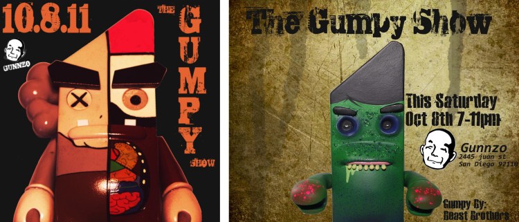 Opening last Saturday (October 8th), the Gumpy Revolution show has finally touched down at San Diego’s Gunnzo gallery. Curated by Gumpy creator, Jose Reynoso, the show features customs of the artist’s trademark character from a huge roster of artists, including the mighty Andrew Bell, Frank Kozik, the Beast Brothers, Marka27, Skinner, Paul Kaiju and J-Ryu.