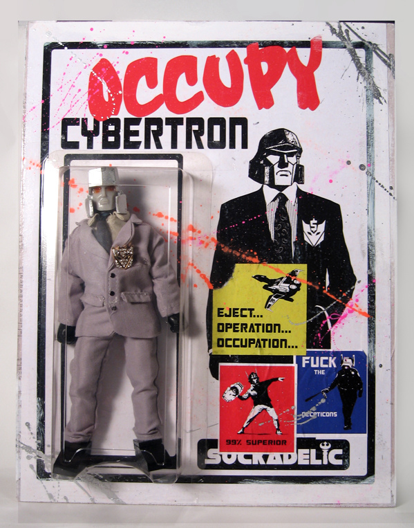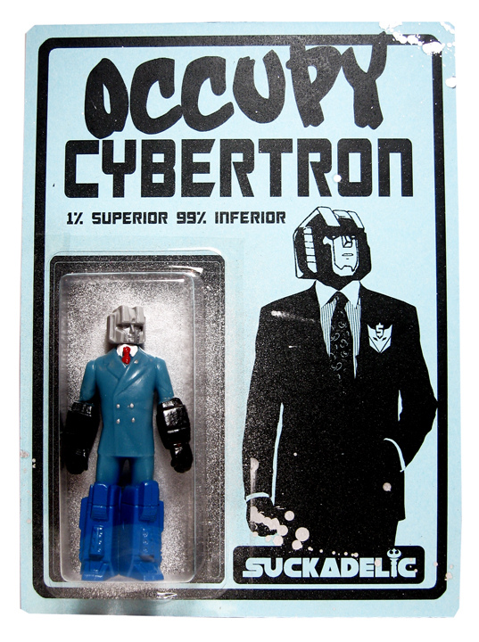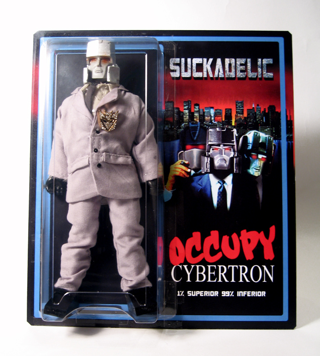 Featured last week here at TTF, the Sucklord’s Occupy Cybertron opened on Monday (December 5th) at the End of the Century retail and gallery space to huge success. Making an unusual departure from his extensive work with the Star Wars universe, the Sucklord’s latest collection of suited and boot-legged Transformers, mini 3″ “protestor” figures, and his first excursion into 8″ “Mego Style” toys are some of the most desirable sucky art we’ve seen!