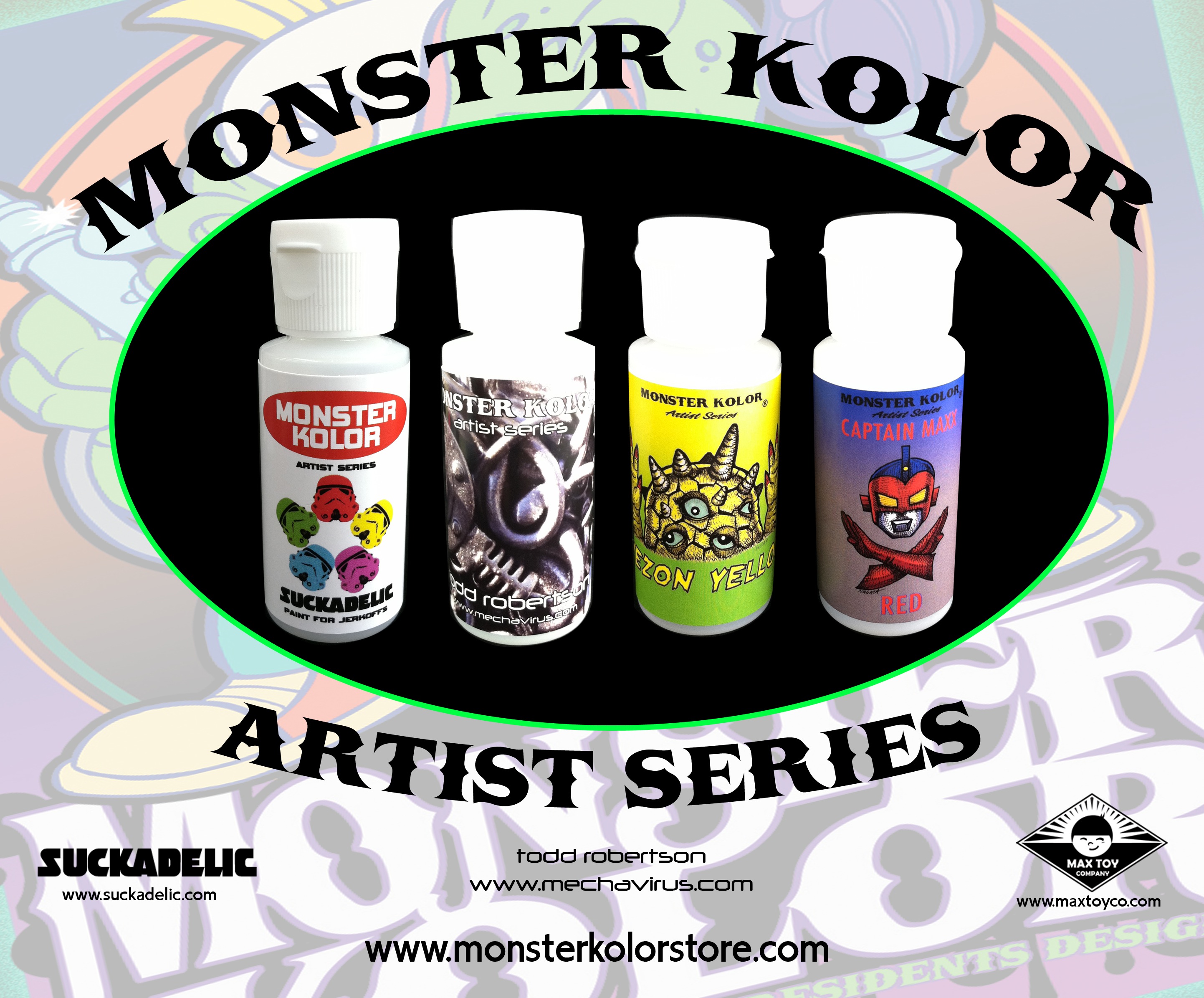 Regarded as the premier paint manufacturer amongst the custom art toy community, Monster Kolor have recently revealed their latest Artist Series of paints to wide fanfare. Featuring collaborations with the Sucklord, Mark Nagata (Max Toy Co), and Todd Robertson (Mecha Virus), Monster Kolor’s Matt Walker has worked side-by-side with each of the artists to create colours that best represent their different styles.