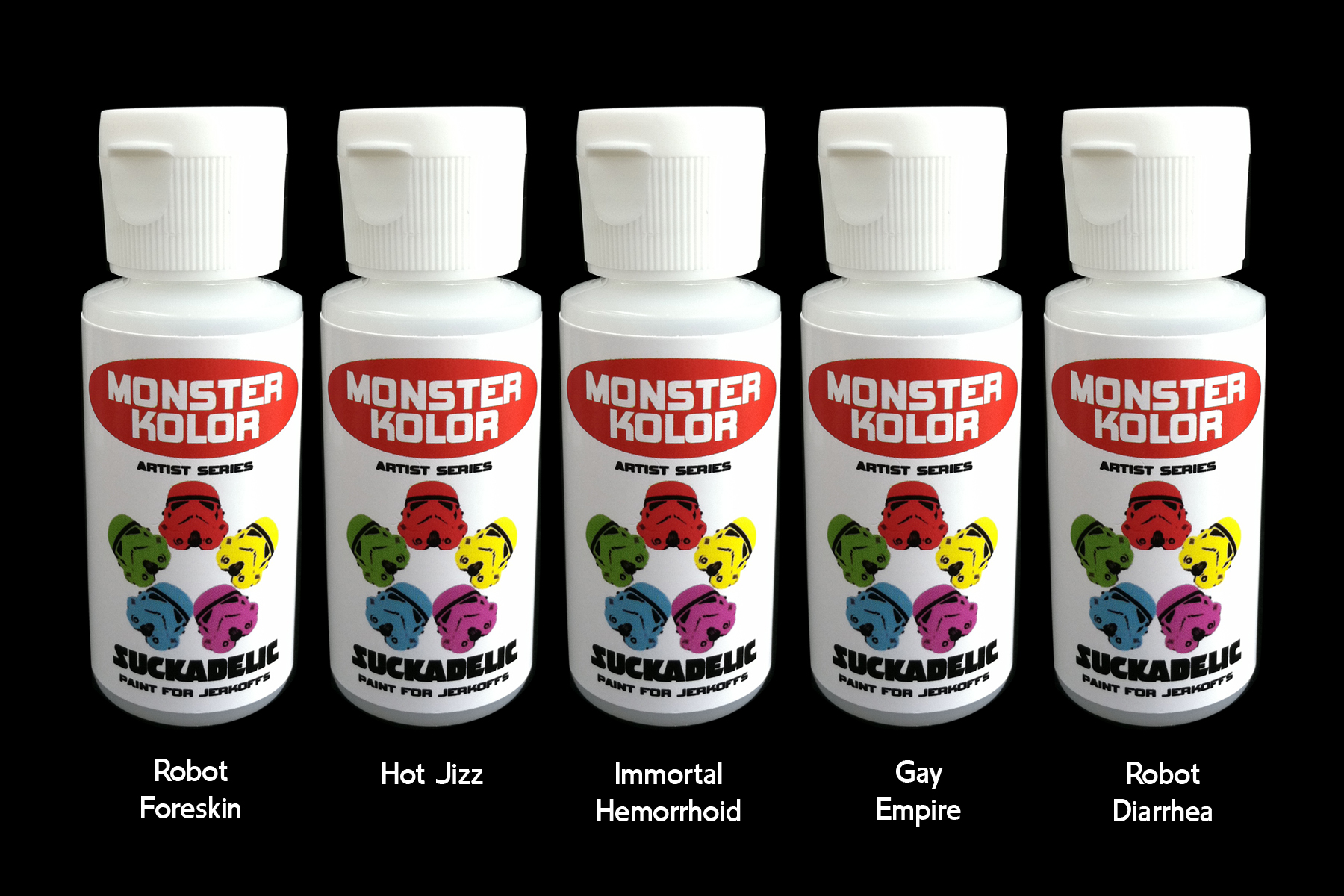Suckadelic: Robot Foreskin, Hot Jizz, Immortal Hemorrhoid, Gay Empire, and Robot Diarrhea in a five colour set.