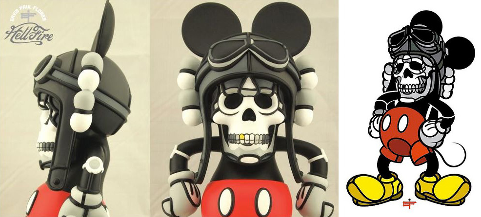 Originally revealed at DKE’s booth at SDCC 2011, David Flores has recently posted pics of his latest vinyl toy, Deathead. Created alongside BIC Plastics, the 10″ figure blends the iconic Mickey Mouse with fighter pilot stylings, skull and crossbones and Flores’ unique bold lines to form one of 2012′s most desirable pieces yet. Check BIC Plastics’ page here for further details.