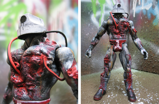 Featured extensively here at the Tru:Teknology Files (including our exclusive interview here), UK graffiti artist Hoakser has been putting the final touches to his latest custom art toy project, The Dominant Species. Standing at 16cm tall, the pair of customised wrestling figures have been burnt, re-sculpted, and sprayed to perfection, featuring Hoakser’s now infamous fat cap head surgery to dazzling effect.