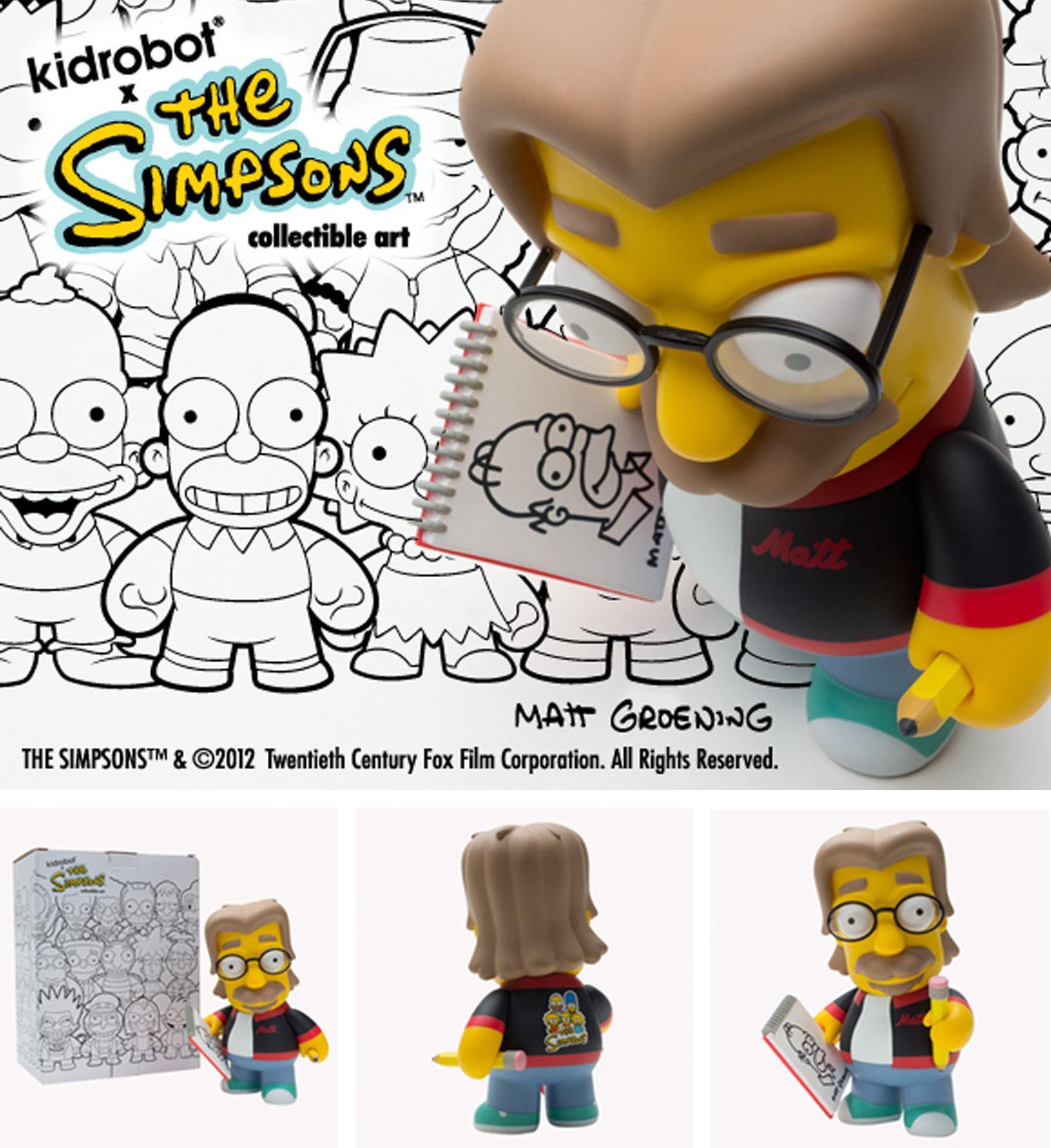 Created by legendary “Life is Hell” cartoonist Matt Groening, THE SIMPSONS is celebrating its 500th episode in February 2012, and Kidrobot is honoring the father of primetime animation in the only way we know how – making him into a 6-inch vinyl toy! Complete with goatee and glasses, director’s jacket, and pad and pencil accessories, it is the first EVER Simpsons Matt Groening toy. -press