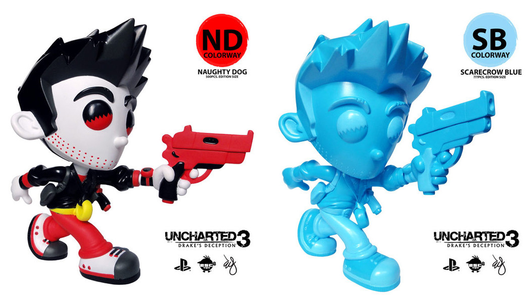 Created by ESCToy’s Erick Scarecrow to celebrate the launch of Unchartered 3 on PS3, both the Scarecrow Blue and Naughty Dog editions of Drake are available to buy through the ESCToy store for $50 each.