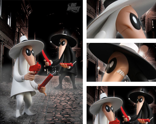 Coinciding with the celebration of Mad Magazine’s 60th Anniversary comes the return of legendary deadly duo, Spy vs Spy. First seen at the Spy vs Spy group custom show last year, the 9″ tall vinyl figures are available to purchase through DC Direct now, priced at $49.95 plus shipping for the pair.