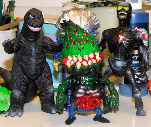 Featured in our toy round-up last week, new images of the upcoming Human Slayer resin figure from Papagrim Toys have surfaced. Based on the 9-Eyed Human Slayer (pictured below) created by illustrator Michael Skattum, the 5″ clear green figure was sculpted and casted by Steve Patt of Papagrim. Now in the final stages of production, Steve has begun a few test sprays, with the results of the first pictured above. It’s important to note that Michael will be painting the initial run of figures, so it’s likely that the end results will wildly differ (here’s hoping not too much, Steve’s mix of spray and brushwork looks pretty special!).
