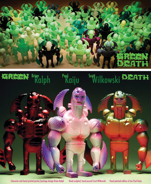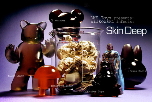 Gaining notoriety for his breathtaking clear skeletal style of (official!) bootlegging, Scott Wilkowski‘s career in art toys has lead numerous successful projects, including the hand sculpt and casted Green Death robot, the Bud and Yoka custom series, Lulubell’s Creature Feature, and most recently, the Skin Deep show.