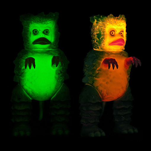 With the ‘Gagamaniacal’ custom show opening at the FOE Gallery this Friday (February 10th), we decided to take a quick look at Bob Conge’s (aka Plaseebo) contribution, the mighty Garamon and Skulloctopus From Outer Space. Standing at 14″ tall, the glow in the dark vinyl toy comes with internal colour changing LEDs that are controlled via a ‘rock’ switch in the back of the head. Available to purchase at the show, pricing on the one-off figure is still to be confirmed, so be sure to keep checking over at the FOE site for further updates…