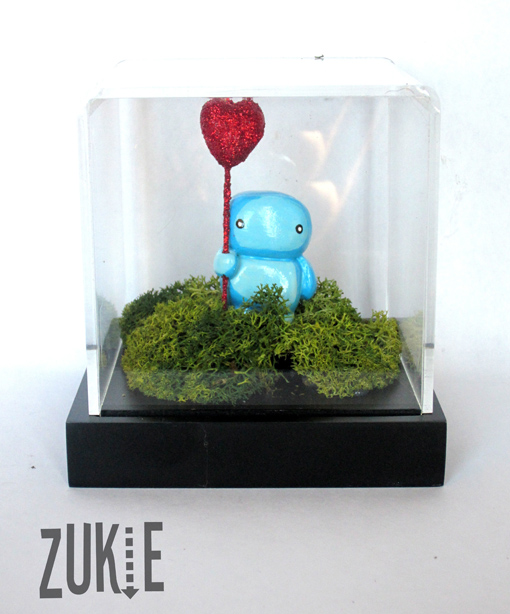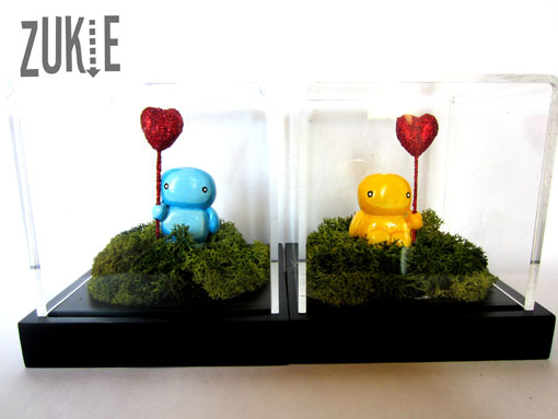 With last week’s Autumn Zukies barely having enough time to acclimatise to the harsh temperatures outside, New York based artist Alison Perez has revealed yet another (slightly more seasonal!) one-off toy project, this time in the form of the adorable Valentine Zukies. Limited to an edition of only 2, the Valentine Zukies are available in yellow or baby blue, come housed in Alison’s now trademark 3″x3″x3″ protective display case (plus heart balloon accessory), and can be purchased exclusively through Alison’s store now for $60 each plus shipping…