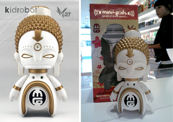 Kidrobot LA let the cat out of the bag through their twitter feed yesterday, revealing pics of the latest Kidrobot exclusive, the white/pearl Asia MiniGod Buddha from Marka27. Limited to just 100 pieces worldwide, the 6″ mini-MiniGod features a functioning speaker that works with ipods, ipads, mp3 players and any audio device with a headphone jack. Priced at only $40 each, the figure will only be available at select Kidrobot retailers across the globe, so anyone interested should start tracking them down now!
