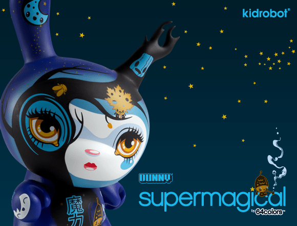 Revealed last week, Supermagical is the latest 8″ Dunny to come from enchanting duo, 64colors– and boy is she a beaut! Similar in style to 2011’s Nature Spirits 3″ Dunny, Supermagical comes with a uniquely sculpted head with branched ear, intricate matte painted details, and captivating watchful eyes. Slated for release on February 23rd, Supermagical will be available for $75 (£60 UK; 69.60€ Europe) through select Kidrobot retailers, limited to 1200 pieces.