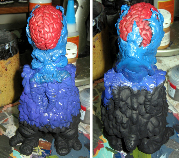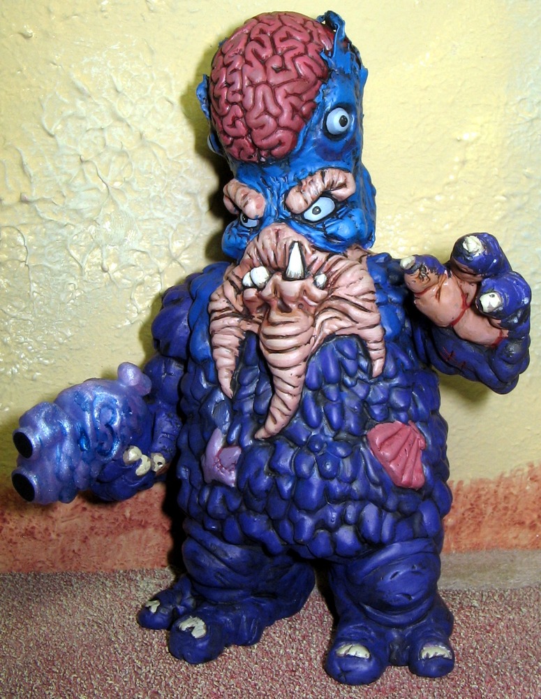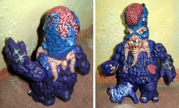 Our good friend Adam Pratt has just revealed his latest toy project, the ‘Cerebragon’ custom Podaigon (originally sculpted by Steven Patt of Papagrim under Halfbad Toyz). Standing at 6″ tall, the 12 ounce hunk of resin comes replete with a Jumping Brain infused cranium, extra sculpted detail, and, as always, an expertly finished custom paint job. Cerebragon has 2 points of articulation (the 2 posable ‘head feet’ have been removed to make way for the brain), plus removable gun for your posing pleasure…