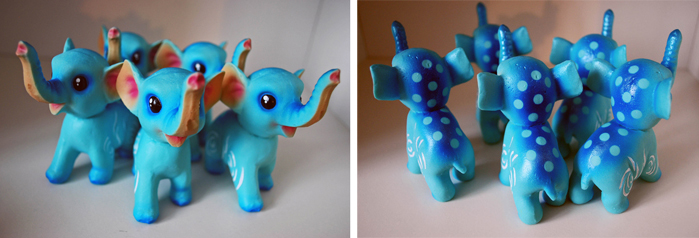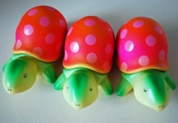 Featuring a hand painted Borris the Bee (from Bwana Spoons), a run of three neon sprayed ‘Kame Collection’ turtles, five dark blue ‘Daydreamer’ Kikkake Zou-Chans, a one-off ‘Au Naturel’ Zou-Chan, a Pink! one-off Kuma-Chan, and a run of three Gargamel Katope birdies, this has ended up more like a zoo than a farm!