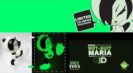 Hot off the heals of the recent ESC Toy x Monster Kolor Wet-Suit Maria collaboration, Erick Scarecrow has just revealed yet another edition of the frog-suited cutie, this time in glow in the dark. Produced by DKE Toys, the 6″ vinyl figure has been limited to just 50 pieces worldwide, with a price tag of around $40. No news yet as to when the toy will drop, but keep track of ESC on twitter for regular updates.