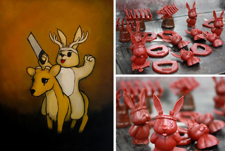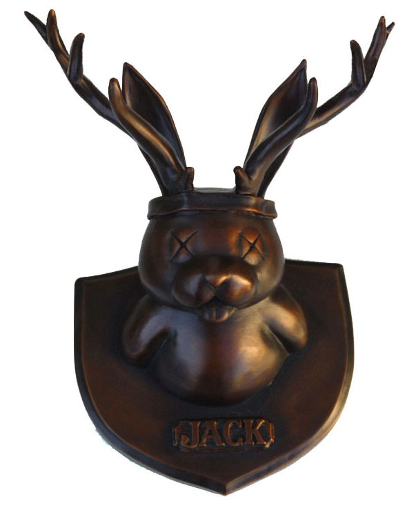 March 7th will see the super-limited release of Luke Chueh‘s latest collaboration with Fully Visual, the bronze “Jack” sculpture. Inspired by Chueh’s “Jacked” painting (pictured) and the mythological “Jackalope”, the sculpture successfully blends the artists character design with the classic taxidermic presentation of the Jackalope, stuffed and mounted on a plaque.