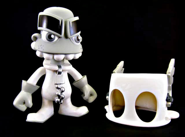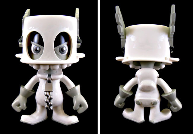 Released last month in prisoner #816 and #913 editions, Jeremy Madl aka MAD has teamed up with De Korner for the release of the latest addition, Morksta. Available exclusively at the De Korner Wondercon 2012 booth (#390), Morksta is said to be a reinterpretation of the good half of the Mork Twins, pre-jail sentence. Featuring a pearlescent and silver colour scheme with raised glossy logo detailing, the vinyl figure has been limited to 50 pieces, available for just $85 each. Any leftover stock will be heading to the De Korner shop after the con, so be sure to keep checking the site regularly for further updates…