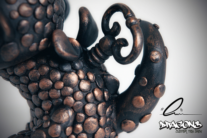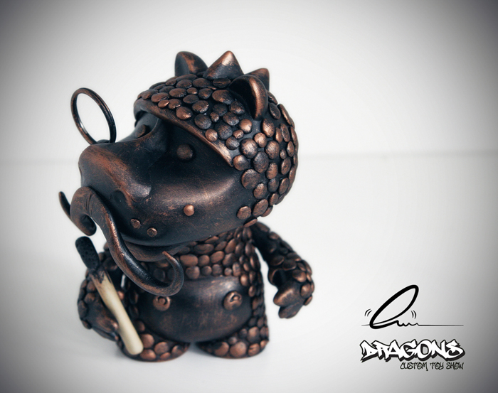 Rich over at UME Toys has sent us some pics of his latest custom pieces, the first coming in the form of ‘Lambert’ the clockwork dragon. Painted in an expertly weathered bronze colour scheme, with a heap of extra sculpted detail (including a beautifully ornate clockwork key, and of course, the obligatory UME monocle and ‘tache!), the custom Kracka was created for Andy Kelly’s (@ZombieKel) forthcoming ‘Dragons Custom Toy Show’ at the Sho Gallery,Cardiff, August 18th 2012. More news on the exhibition soon…