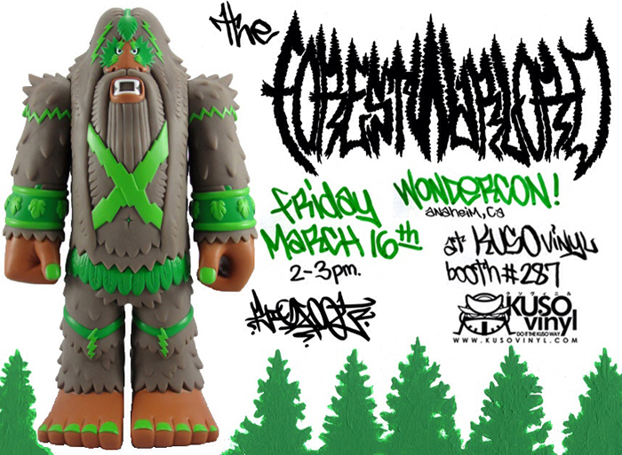 Standing at 11″ tall, the Forrest Warlord’s imposing stature, chunky sculpt style, and beautiful use of colour bares all the hallmarks of Bigfoot’s original StrangeCo toys, whilst bringing his trademark character bang-up-to-date- an essential piece for any collection! Kuso Vinyl will be debuting the Forest Warlord at their Wondercon booth (#287) next weekend, with Bigfoot on hand on Friday (March 16th) from 2 to 3pm for signing duties. Stay tuned for more info on the general release soon…