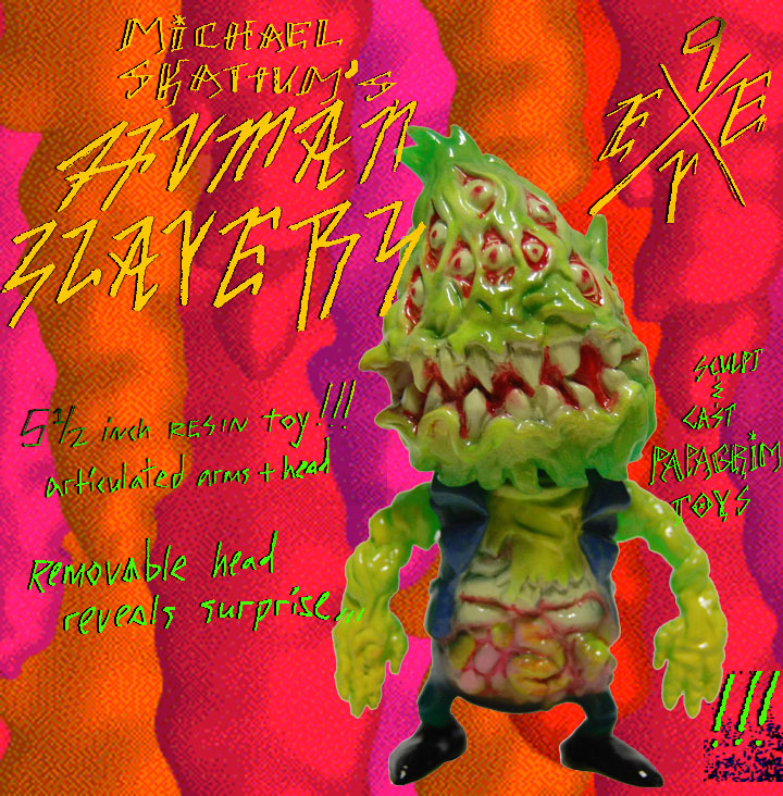 Featured several times here on MAN-E-TOYS over the past couple of months, Michael Skattum‘s Human Slayer figure has finally been revealed in all its glory. Designed by Skattum, and hand sculpt/cast by Steve Patt of Papa Grim Toys, the 5.5″ tall ‘Nine Eyed Demon’ has been cast in fluorescent clear green resin, featuring a beautiful mix of airbrush, brush and homemade decal detailing. Coming with fully articulated arms and head, the Human Slayer’s mask can be removed to reveal a secret surprise! Limited to a run of just 20 (with 16 currently unspoken for), the Human Slayer is available exclusively from Skattum’s Big Cartel for $80 plus shipping…