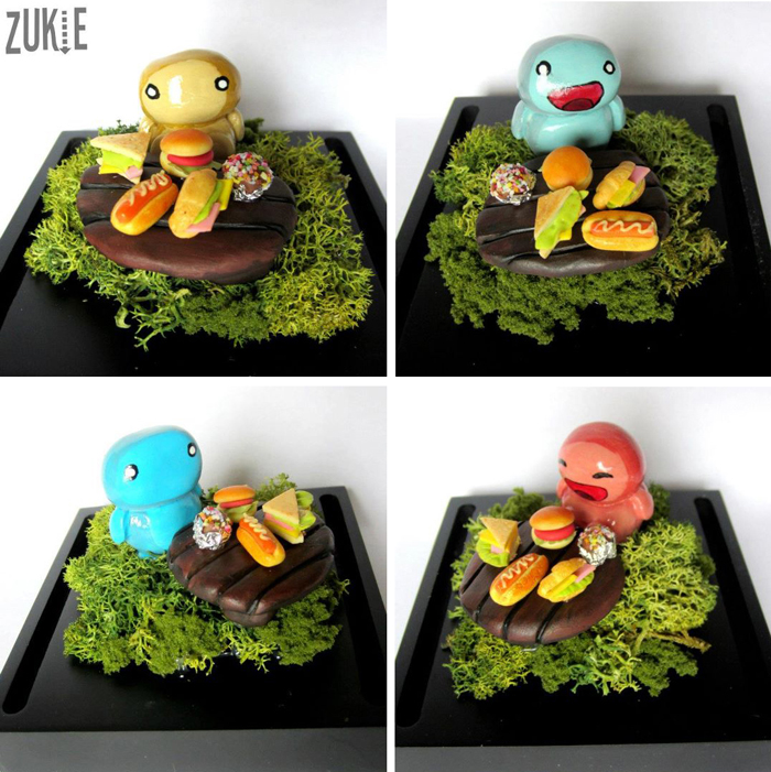First up come the food loving Super Hungry Zukies. Limited to an edition of 4, each hand sculpted Zukie comes with his own picnic bench and a variety of delectable treats to devour. Available in either blue, light blue, red or yellow, the Zukies come housed in the now standard 3″x3″x3″ plexi glass display for protection. Priced at $65 each plus shipping, the Super Hungry Zukies will be available from Alison’s store on Wednesday March 21 at 12pm EST.