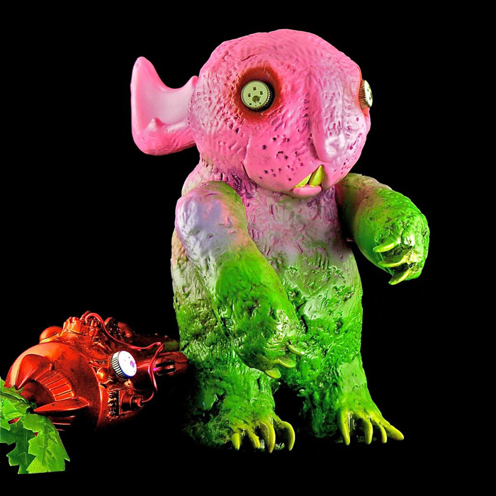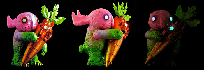 Bob Conge aka Plaseebo shares with us his entry for the upcoming Bellicosity Show at TAG next Friday (March 23rd), entitled “Robobunzilla And The Atomic Carrot”. Featuring the freaked-out character design and sculpting style we’ve come to expect from the legendary artist, Plaseebo’s Robobunzilla takes Nathan Hamill’s cute looking figure into the creepy realms of neo-kaiju to great effect. Coming with light effective LEDs in Robobunzilla’s eyes and in the clock of the Atomic Carrot, the beautifully hand sprayed design manages to pop in both light and dark. No news with regards to pricing on the one-off piece, so be sure to head over to TAG’s site after the show’s opening for more details…