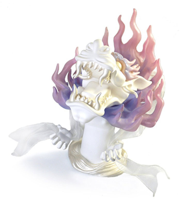 Coinciding with Yoskay Yamamoto‘s exhibition, “Joke’s On Me”, this weekend (March 24th) at Lebasse Chinatown, Munky King are proud to present the fourth edition of the artist’s ‘Screaming for the Sunrise’ figure. Coming in a mesmerising ‘Pearl’ colourway, the 6″ tall vinyl dragon comes with a removable sheer ribbon and is packaged in a decadent gold foil box. Available exclusively through Munky King from March 26th with a price tag of $120, the ‘Pearl’ edition has been limited to just 200 pieces. Anyone interested in getting a look at the figure beforehand should head over to Yoskay’s show this weekend, where the stunning piece will be making it’s debut…