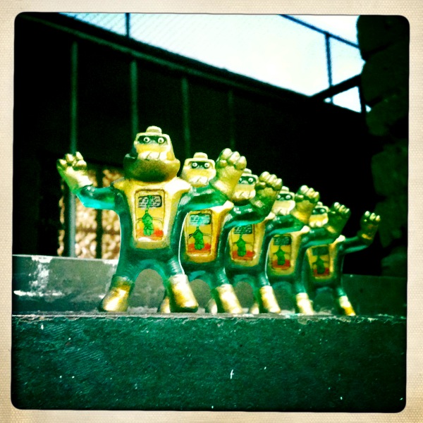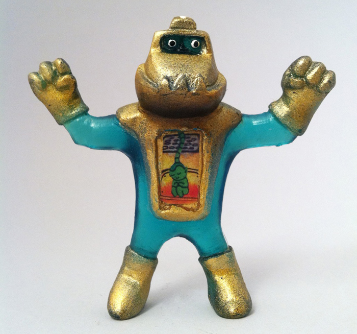 This month saw the opening of Peter Kato‘s long awaited online store, giving us, and all of Peter’s other hardcore fans the chance of finally picking up the sought after First Turtle Tetsujin alongside a host of other awesome resin minis and buttons. Unfortunately, many missed Peter’s signature figure (the little guy vanished pretty quickly!), so in response Peter has swiftly produced version 2, the beautiful Green-Gold Leader Turtle Tetsujin! Cast in clear green resin with gold-leaf metallic detailing and solid racing stripes, Leader TT sees the return of illustrated character Little Pea, the sleeping fetus that lives in and gives inspiration to the giant robot. Released exclusively through peterkatoshop.com last night (March 20th), Green-Gold Leader Turtle Tetsujin has been limited to an edition of 12 with a price tag of just $20 a piece plus shipping…