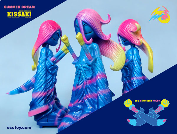 Dropping in the ESC Toy store as I write this comes Eric Scarecrow’s latest collaboration with Monster Kolor, the ‘Summer Dream’ Kissaki. Standing at a loft 10″ tall, the fourth edition of Kissaki has been hand painted and sprayed by Eric using a vivid palette of Monster Kolor paints. Limited to just 9 pieces worldwide, anyone lucky enough to score this beautiful figure will also receive a limited edition Kissaki print. Priced at just $200 a piece (with $1 shipping in the US), be sure to head over to the ESC store at 11am EST to secure yours…