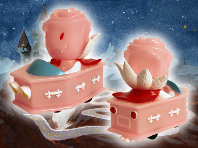 With the original Casket Cruiser selling out in a matter of days, Super7 have swiftly readied the next colourway of Josh Herbolsheimer’s awesome figure, dubbed the ‘Pink Prowler’. Featuring the loveable Rose Vampire in his ride of choice, the latest edition has been cast in pink glow-in-the-dark vinyl, with red, white and blue sprays. Beautifully understated during the day, and outrageously pink at night, the Pink Prowler’s colour scheme has got to be one of our favourites from the kaiju/sofubi giants yet. Dropping on the Super7 store next Thursday (April 5th) at Noon PST, the Pink Prowler Casket Cruiser will be available in limited quantities for just $65 plus shipping…