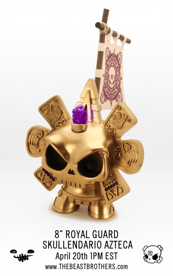 Hot off the heals of last month’s ‘Ivory Warrior’ Skullendario 8″ custom Dunny series, The Beast Brothers and Huck Gee are back again with their latest instalment, the Royal Guard. Coming in a beautiful golden colour scheme, the Royal Guard has several noticeable differences from it’s forbearer, including the lack a protruding tongue, purple embedded Swarovski crystals, and a glowing resin kanji inscribed head piece. Hand cast and painted by The Beast Brothers, each piece comes signed, numbered and packaged in a laser etched wooden box. As with Ivory Warrior, the Royal Guard has been priced at just $475 (a steal for such a huge collaboration!), and will be hittingThe Beast Brothers store for 24 hours from April 20th at 1pm EST.
