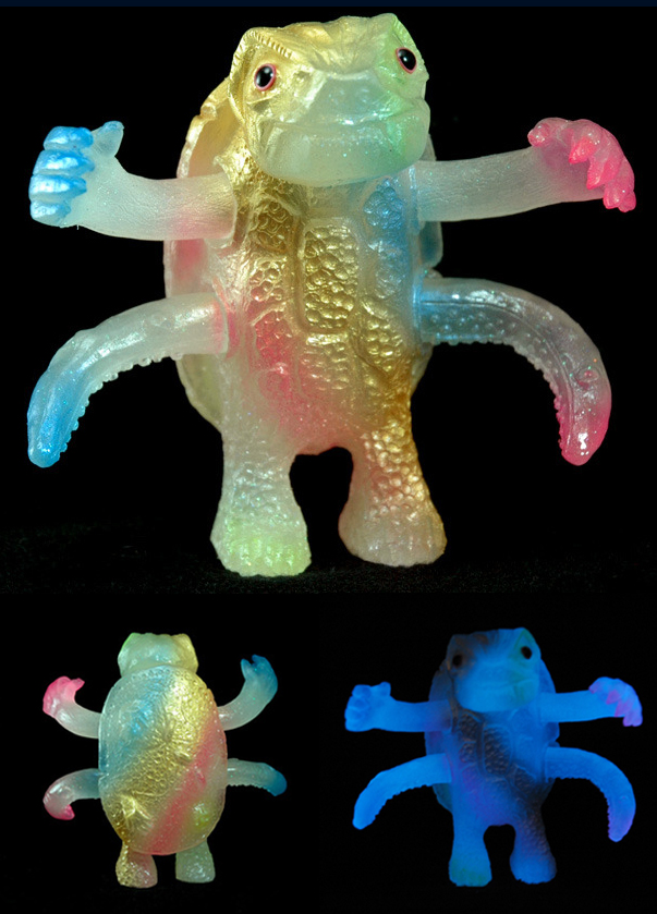 Coming with 5 points of articulation, ‘Slippery Rock’ Rokuashi stands at a sizeable 5″ tall. Cast in GID sparkle resin, each lovingly crafted figure has been hand painted in metallic gold, blue, fluorescent pink, and green spray. Limited to just 3 pieces, the tentacled turtle comes bagged with a laminated name card for just $80 plus shipping.