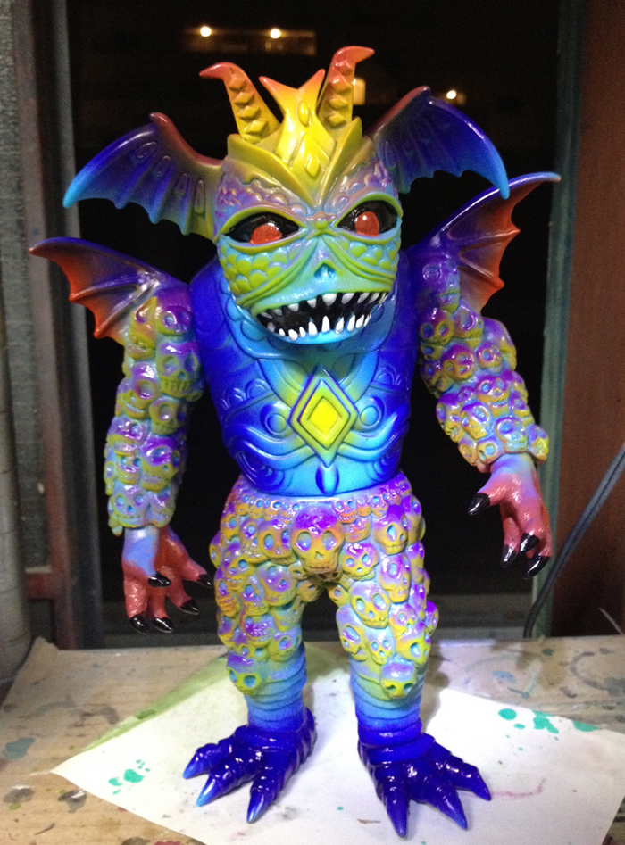 Lulubell Toys (I know, twice in one day!) are proud to reveal the first test shot of their latest collaboration with Skinner, the Ultrus Bog “Blue Velvet Star Crusher” version! The second standard edition of this 10″ beast, the fully articulated “Blue Velvet Star Crusher” has been cast in baby blue vinyl, featuring a psychedelic mix of metallic purple, royal blue, yellow, brick red and black spray accents. Available to pre-order exclusively from the Lulubell Toy store now, Ultrus Bog has been priced at $85 plus shipping. Expect this guy to ship late May/early June…