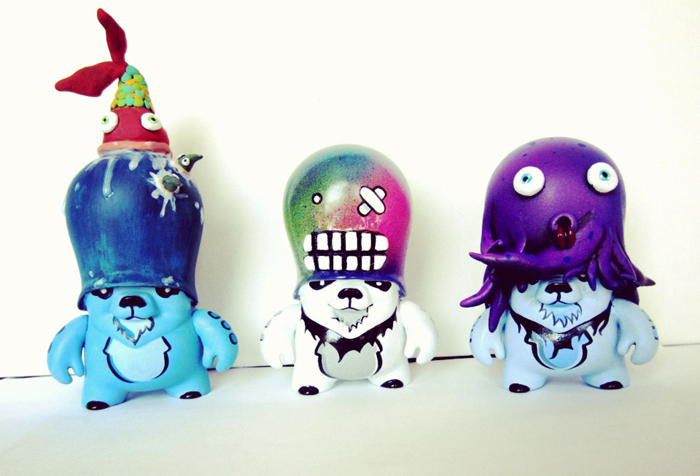 Next up we have three new custom 3.5″ Teddy Troopers. Continuing her popular “Krun-Churz” style, the first has been coloured in a mixture of green, blue, pink and purple sprays, coming with the trade mark b/w eye detailing and chomping teeth that we all know and love. The other two take a more aquatic approach to design, featuring a beautifully sculpted octopus and the return of the “Fishing Sux” koi to dazzling effect. All three of these guys will be heading to the Zukie store this week for an undisclosed price…