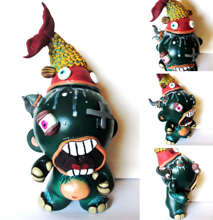 We were beginning to worry that Alison Perez aka Miss Zukie was showing signs of slowing down (ok, it’s only been a week since our last Zukie post!), so it came with great pleasure yesterday to find not one, but three new custom projects and a contest announcement in our inbox yesterday! First up we have the absolutely hilarious “Fishing Sux” custom 7″ Munny. Created for the upcoming Kidrobot Munnyworld Contest, the beautifully sprayed and hand painted figure comes with three koi fish (a mother and 2 babies) profusely sucking on the poor little guys head! Alison has really upped her sculpting game on this piece, with the addition of subtle detailing on the feet, claws and mouth really helping this custom to pop! Unfortunately, we have no news as to whether this piece will be available to purchase after the event, so be sure to stay locked-on to Alison’s blog for updates…