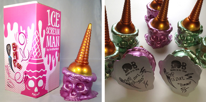 Bryan over at Brutherford Industries is proud to reveal the first custom “Ice Scream Man” series from the Brown Magic Paint Co. Known for their decadent custom pieces ranging from iPhone cases to vintage luggage, BMP Co have given the highly popular vinyl figure a stunning metallic makeover that stays true to the already brilliant original. Available in 2 colourways, “Stainless Steel Strawberry” and “Heavy Metal Mint”, the pair have been limited to just 5 pieces, each coming signed and numbered with their own BMP customised box. Available on the Brutherford Industires store now, the metallic Ice Scream Man can be yours for just $125 plus shipping…