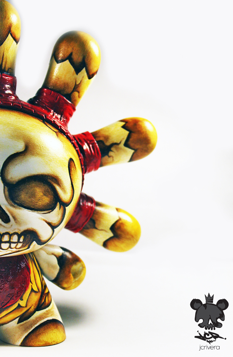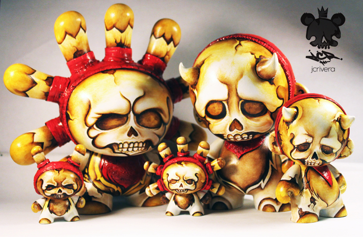 The ever busy JC Rivera (yes, this is the third post he’s featured in this week!) is proud to reveal his entry for 1AM‘s Most Wanted show, not one, but five amazing customs! Featuring a seven eared 8″ and 3″ Dunny, a horned 7″ and 5″ Munny, and a 3″ Dunny, Rivera’s trademark skull motif has been beautifully realised, featuring the ultra-tight sculpting and brush work we’ve come to expect from the prolific artist. No news on availability or pricing on these, so stay tuned for more info in the coming weeks as we lead up to the show…