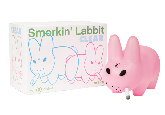 The Labbit train shows no sign of slowing this year as Frank Kozik and Kidrobot reveal yet another stunning edition, the 10″ Clear Smorkin’ Labbit. Shining bright in 2 lambent shades, Pink and Blue, the clear cast vinyl figure will be available from May 10th at Kidrobot stores, Kidrobot.com and select retailers worldwide for just $60 each…