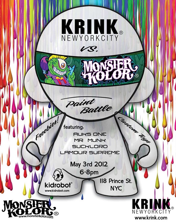 Next month sees Kidrobot NYC play host to the first ever Krink NYC vs. Monster Kolor Paint Battle! With Auks One and Mr Munk fighting in the Krink corner, Matt Walker’s calling on the talents of Lamour Supreme and the Sucklord to throw down some paint for the MK team. Featuring a plethora of live painting, custom toys and freebies, be sure to head down to KRNY on May 3rd at 6pm for what could be the battle of the century!