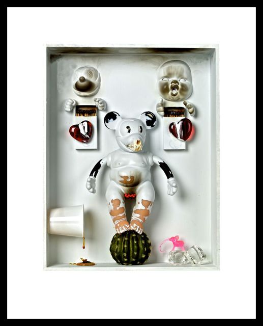 Joining the awesome “HD@: Humpty Dumpty Reanimated” custom at the upcoming “BITS” show at Lot F Gallery (read more here) comes the latest wave of prints from artist Bob Conge (aka Plaseebo). Featuring a mixture of found objects, vacuum tubes and Bob’s signature doll and Mickey Mouse pieces, these twisted toy shrines will be available as jumbo folio giclee prints, (18″ x 24″ images on 24″ x 32″ sheets of 200 gsm archival cotton rag paper), each signed, numbered and limited to an edition of 50. Head over to the Lot F Gallery site for more information on picking up one of these amazing pieces…