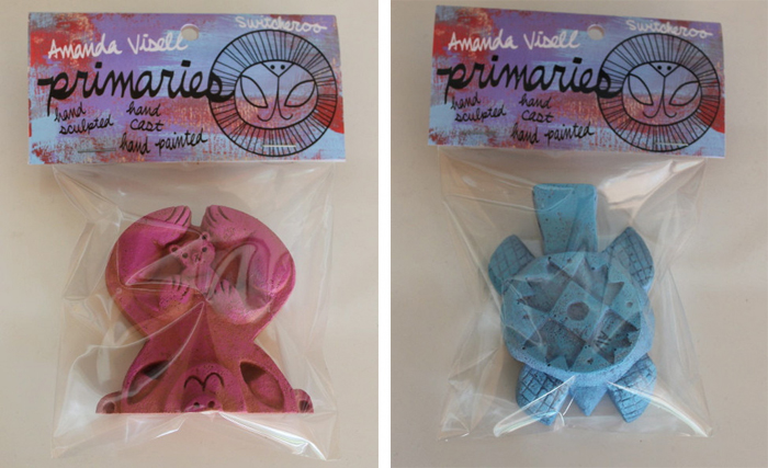 After a week of teasers on her blog, Amanda Visell has finally released her new “Primaries” series out into the wild! Featuring 5 different creatures sculpted in Visell’s unmistakable style, the 3″ tall figures have been hand sculpted, cast and painted at her studio in Los Angeles. Featuring a bear, lion, pegasus, rain monster and set-exclusive turtle design, the toys come in either pink/orange or blue/green washes and can be bought individually for $30 or as a set (with the aforementioned turtle) for just $150 plus shipping. Available exclusively on the Switcheroo store right now, each lovingly crafted figure comes bagged with a header card designed by Visell…