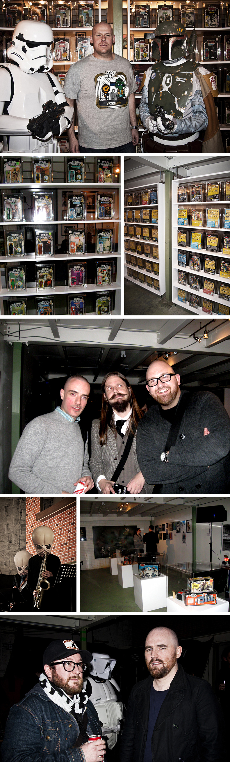 As you can see, a great time was had by all, but the fun didn’t stop at the artwork and alcohol… Nestling amongst the various paintings, prints and customs was one of the largest displays of vintage Star Wars toys we have ever witnessed! Featuring a massive selection of carded figures alongside some extremely rare playsets and vehicles (boxed Imperial Attack Base and Troop Transporter anyone?!!), the whole collection was housed in a beautiful display that reportedly cost around £1000 to construct!