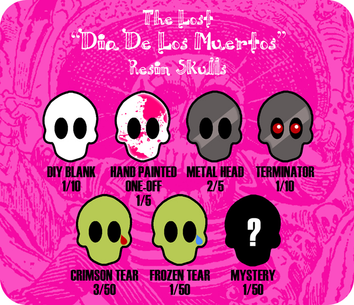 If you’ve been following us on Twitter or Instagram (@trutek) over the last couple of weeks, you may have noticed a few shots of our latest resin project, the Lost “Dia de los Muertos” Skulls… well today we’ve finally decided to give you guys the lowdown, with 2 massive points we have to get off our chest before we start- first off, half of them will be free (yes, FREE!), and secondly, the rest will be hitting the store before next month’s Min-E-Face and ‘Ed Skworm release- EXCITING!!!
