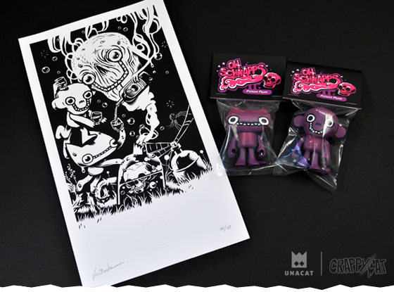 Fresh from the recent success of the Crap Stink Splasher (find out more here), Vanbeater is proud to reveal the latest CrappyCat and FlunkMonkey set, “Oh Schnapps Poison Plum”! The first in an ongoing series of schnapps related colourways, the set will once again feature both vinyl mini figures, with a beautiful 7.5″x13″ signed, stamped and numbered Poison Plum screen print. Limited to just 125 pieces, the set will be available on the CrappyCat store from 16th May, 2pm (EST) for a 48 hour period. Priced at just $35 shipped (within the US), these guys probably won’t make the whole 2 days anyway!